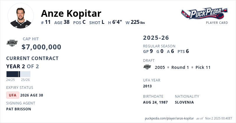 Anze Kopitar is signed to a 2 year, $14,000,000 contract with a cap hit of $7,000,000 per season, playing for the Los Angeles Kings. His contract expires at the end of the 2025-26 season, making Kopitar an Unrestricted Free Agent.