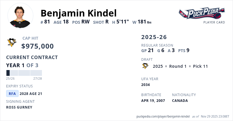 Benjamin Kindel is signed to a 3 year, $2,925,000 contract with a cap hit of $975,000 per season, playing for the Pittsburgh Penguins. His contract expires at the end of the 2027-28 season, making Kindel a Restricted Free Agent.