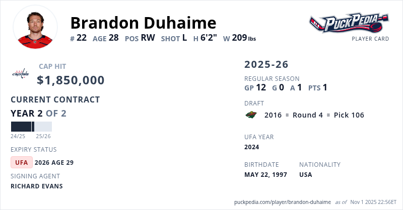 Brandon Duhaime is signed to a 2 year, $3,700,000 contract with a cap hit of $1,850,000 per season, playing for the Washington Capitals. His contract expires at the end of the 2025-26 season, making Duhaime an Unrestricted Free Agent.