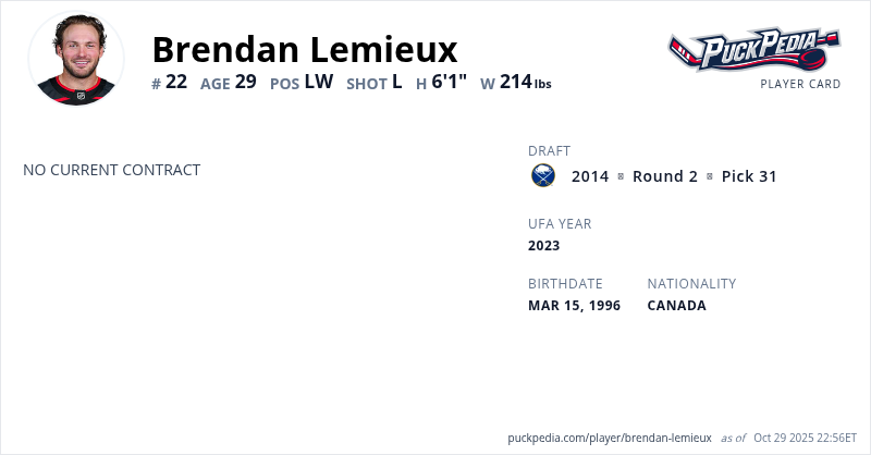 Brendan Lemieux is an Unrestricted Free Agent. His last contract was 1 year, $775,000 with a cap hit of $775,000 per season.