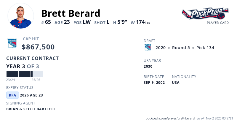Brett Berard is signed to a 3 year, $2,602,500 contract with a cap hit of $867,500 per season, playing for the New York Rangers. His contract expires at the end of the 2025-26 season, making Berard a Restricted Free Agent.