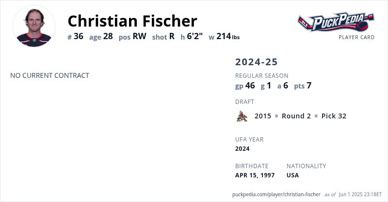 Christian Fischer is an Unrestricted Free Agent. His last contract was 1 year, $1,125,000 with a cap hit of $1,125,000 per season. It expired at the end of the 2024-25 season.