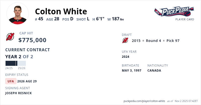 Colton White is signed to a 2 year, $1,550,000 contract with a cap hit of $775,000 per season, playing for the New Jersey Devils. His contract expires at the end of the 2025-26 season, making White an Unrestricted Free Agent.