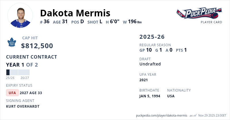 Dakota Mermis is signed to a 2 year, $1,625,000 contract with a cap hit of $812,500 per season, playing for the Toronto Maple Leafs. His contract expires at the end of the 2026-27 season, making Mermis an Unrestricted Free Agent.