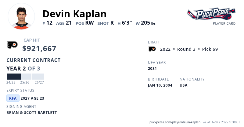 Devin Kaplan is signed to a 3 year, $2,765,001 contract with a cap hit of $921,667 per season, playing for the Philadelphia Flyers. His contract expires at the end of the 2026-27 season, making Kaplan a Restricted Free Agent.