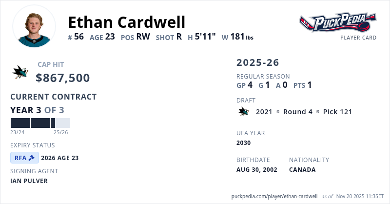 Ethan Cardwell is signed to a 3 year, $2,602,500 contract with a cap hit of $867,500 per season, playing for the San Jose Sharks. His contract expires at the end of the 2025-26 season, making Cardwell a Restricted Free Agent.