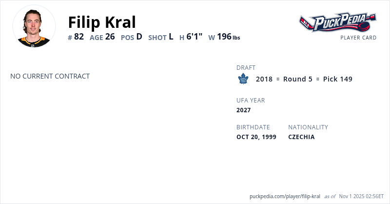 Filip Kral is an Unrestricted Free Agent (Group 6). His last contract was 1 year, $775,000 with a cap hit of $775,000 per season. It expired at the end of the 2024-25 season.