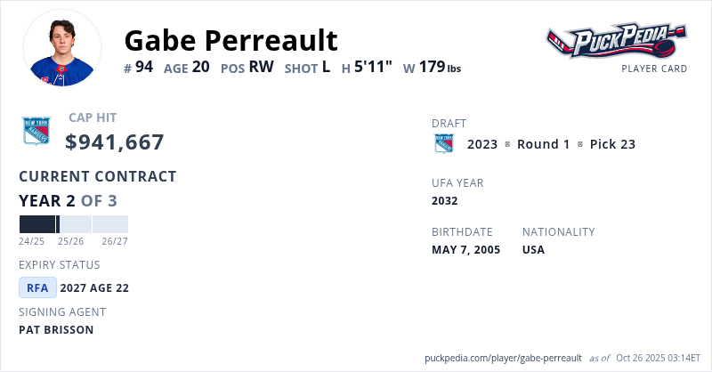 Gabe Perreault is signed to a 3 year, $2,825,001 contract with a cap hit of $941,667 per season, playing for the New York Rangers. His contract expires at the end of the 2026-27 season, making Perreault a Restricted Free Agent.