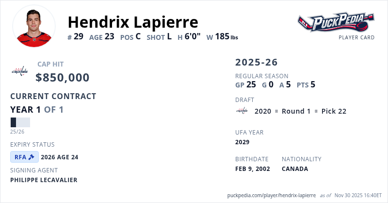 Hendrix Lapierre is signed to a 1 year, $850,000 contract with a cap hit of $850,000 per season, playing for the Washington Capitals. His contract expires at the end of the 2025-26 season, making Lapierre a Restricted Free Agent.