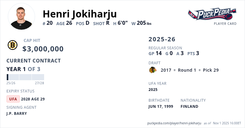Henri Jokiharju is signed to a 3 year, $9,000,000 contract with a cap hit of $3,000,000 per season, playing for the Boston Bruins. His contract expires at the end of the 2027-28 season, making Jokiharju an Unrestricted Free Agent.
