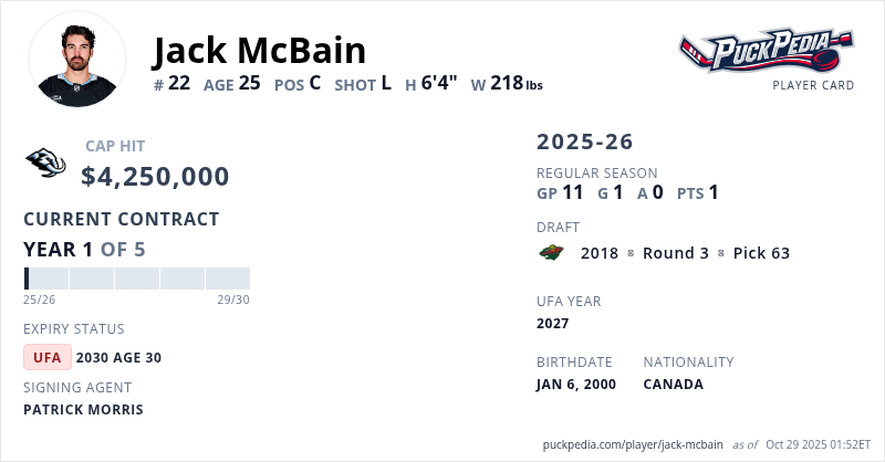 Jack McBain is signed to a 5 year, $21,250,000 contract with a cap hit of $4,250,000 per season, playing for the Utah Mammoth. His contract expires at the end of the 2029-30 season, making McBain an Unrestricted Free Agent.