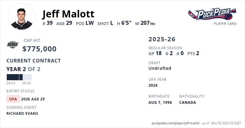 Jeff Malott is signed to a 2 year, $1,550,000 contract with a cap hit of $775,000 per season, playing for the Los Angeles Kings. His contract expires at the end of the 2025-26 season, making Malott an Unrestricted Free Agent.