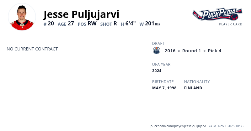 Jesse Puljujarvi is an Unrestricted Free Agent. His last contract was 1 year, $775,000 with a cap hit of $775,000 per season. It expired at the end of the 2024-25 season.