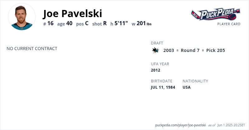 Joe Pavelski is an Unrestricted Free Agent. His last contract was 1 year, $3,500,000 with a cap hit of $3,500,000 per season. It expired at the end of the 2023-24 season.