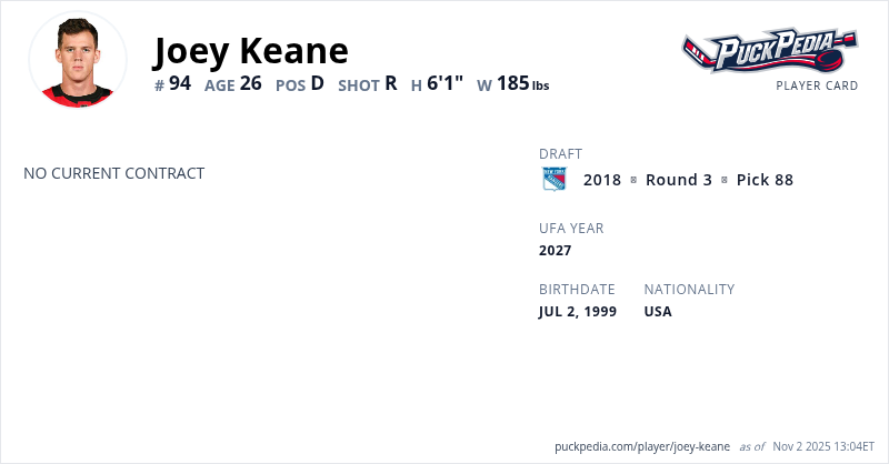 Joey Keane is a Restricted Free Agent. His last contract was 3 years, $2,427,498 with a cap hit of $809,166 per season. It expired at the end of the 2021-22 season.