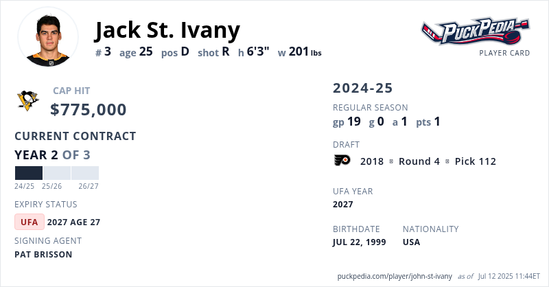 Jack St. Ivany is signed to a 3 year, $2,325,000 contract with a cap hit of $775,000 per season, playing for the Pittsburgh Penguins. His contract expires at the end of the 2026-27 season, making St. Ivany an Unrestricted Free Agent.