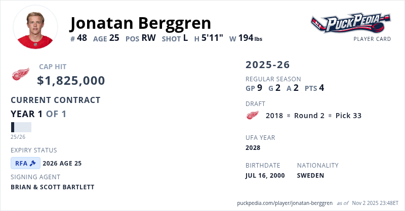 Jonatan Berggren is signed to a 1 year, $1,825,000 contract with a cap hit of $1,825,000 per season, playing for the Detroit Red Wings. His contract expires at the end of the 2025-26 season, making Berggren a Restricted Free Agent.