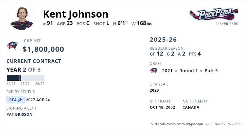 Kent Johnson is signed to a 3 year, $5,400,000 contract with a cap hit of $1,800,000 per season, playing for the Columbus Blue Jackets. His contract expires at the end of the 2026-27 season, making Johnson a Restricted Free Agent.