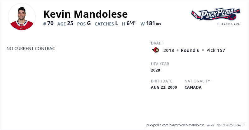 Kevin Mandolese is an Unrestricted Free Agent (No Qualifying Offer). His last contract was 1 year, $775,000 with a cap hit of $775,000 per season. It expired at the end of the 2024-25 season.