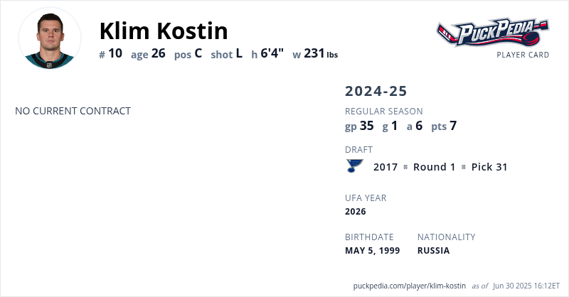Klim Kostin is an Unrestricted Free Agent (No Qualifying Offer). His last contract was 2 years, $4,000,000 with a cap hit of $2,000,000 per season. It expired at the end of the 2024-25 season.