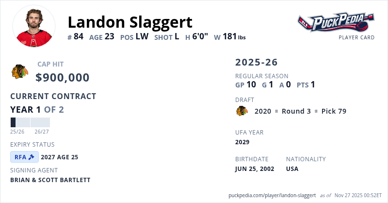 Landon Slaggert is signed to a 2 year, $1,800,000 contract with a cap hit of $900,000 per season, playing for the Chicago Blackhawks. His contract expires at the end of the 2026-27 season, making Slaggert a Restricted Free Agent.