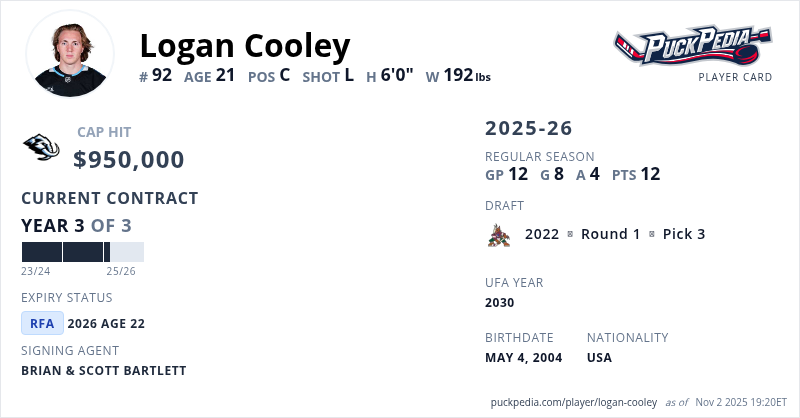 Logan Cooley is signed to a 8 year, $80,000,000 contract extension with a cap hit of $10,000,000 per season. He plays for the Utah Mammoth. His next contract begins for the 2026-27 season and expires at the end of the 2033-34 season, making him an Unrestricted Free Agent.
