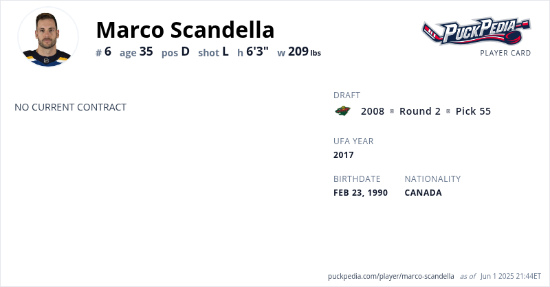 Marco Scandella is an Unrestricted Free Agent. His last contract was 4 years, $13,100,000 with a cap hit of $3,275,000 per season. It expired at the end of the 2023-24 season.