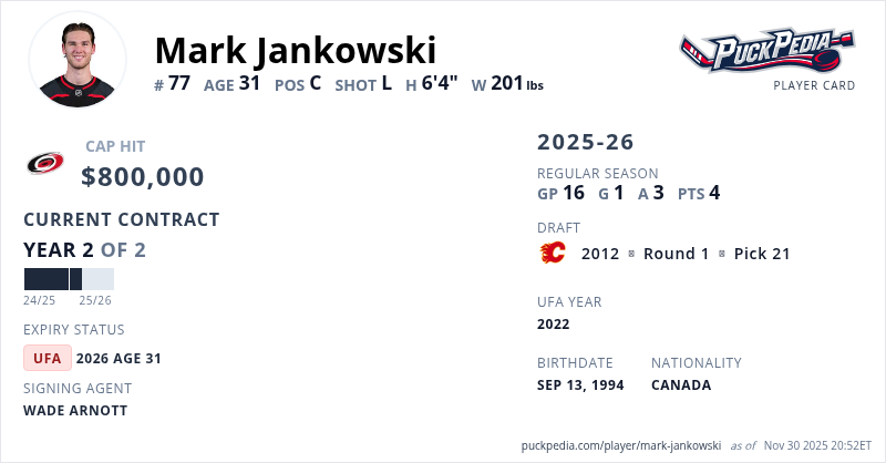Mark Jankowski is signed to a 2 year, $1,600,000 contract with a cap hit of $800,000 per season, playing for the Carolina Hurricanes. His contract expires at the end of the 2025-26 season, making Jankowski an Unrestricted Free Agent.