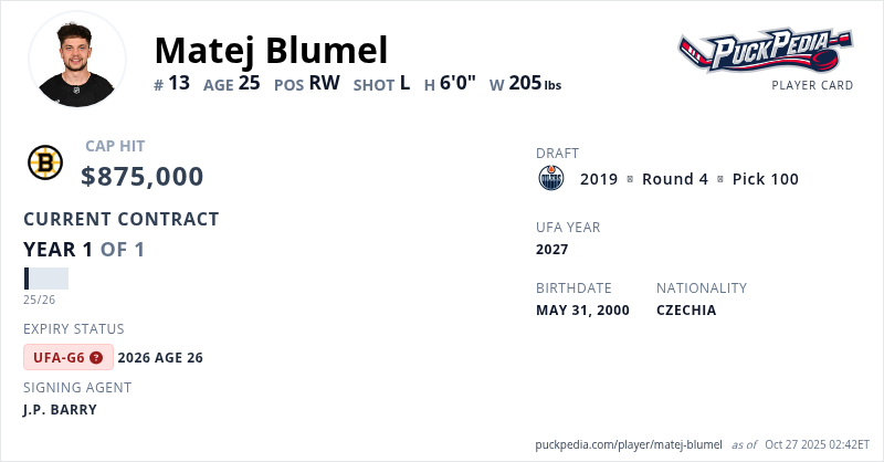 Matej Blumel is signed to a 1 year, $875,000 contract with a cap hit of $875,000 per season, playing for the Boston Bruins. His contract expires at the end of the 2025-26 season, making Blumel an Unrestricted Free Agent (Group 6).