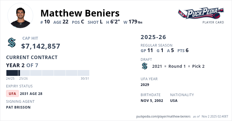 Matthew Beniers is signed to a 7 year, $49,999,999 contract with a cap hit of $7,142,857 per season, playing for the Seattle Kraken. His contract expires at the end of the 2030-31 season, making Beniers an Unrestricted Free Agent.