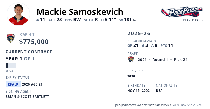 Mackie Samoskevich is signed to a 1 year, $775,000 contract with a cap hit of $775,000 per season, playing for the Florida Panthers. His contract expires at the end of the 2025-26 season, making Samoskevich a Restricted Free Agent.