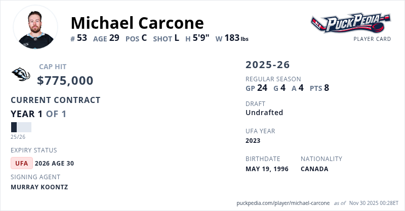 Michael Carcone is signed to a 1 year, $775,000 contract with a cap hit of $775,000 per season, playing for the Utah Mammoth. His contract expires at the end of the 2025-26 season, making Carcone an Unrestricted Free Agent.