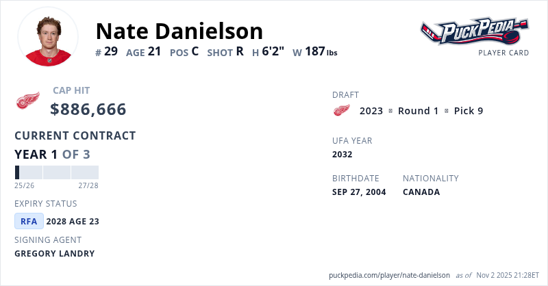 Nate Danielson is signed to a 3 year, $2,659,998 contract with a cap hit of $886,666 per season, playing for the Detroit Red Wings. His contract expires at the end of the 2027-28 season, making Danielson a Restricted Free Agent.