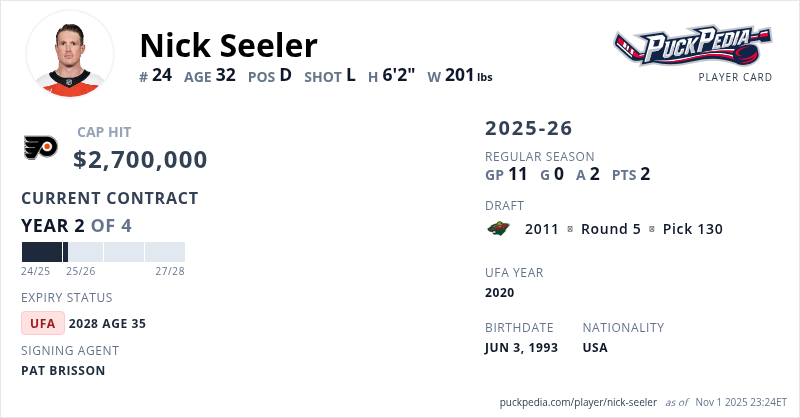 Nick Seeler is signed to a 4 year, $10,800,000 contract with a cap hit of $2,700,000 per season, playing for the Philadelphia Flyers. His contract expires at the end of the 2027-28 season, making Seeler an Unrestricted Free Agent.