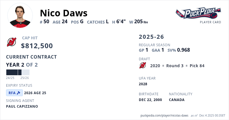 Nico Daws is signed to a 2 year, $1,625,000 contract with a cap hit of $812,500 per season, playing for the New Jersey Devils. His contract expires at the end of the 2025-26 season, making Daws a Restricted Free Agent.