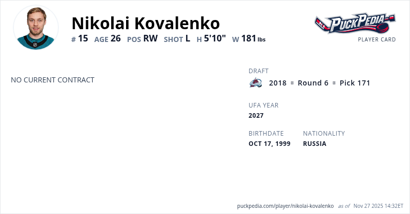 Nikolai Kovalenko is an Unrestricted Free Agent (No Qualifying Offer). His last contract was 2 years, $1,792,500 with a cap hit of $896,250 per season. It expired at the end of the 2024-25 season.