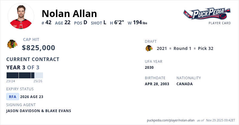 Nolan Allan is signed to a 3 year, $2,475,000 contract with a cap hit of $825,000 per season, playing for the Chicago Blackhawks. His contract expires at the end of the 2025-26 season, making Allan a Restricted Free Agent.
