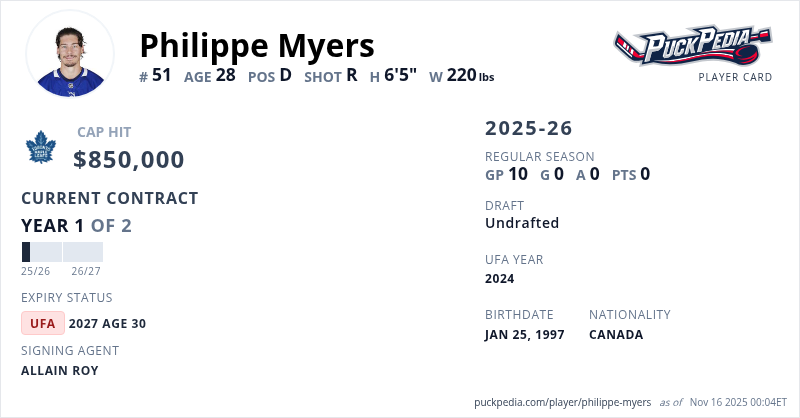 Philippe Myers is signed to a 2 year, $1,700,000 contract with a cap hit of $850,000 per season, playing for the Toronto Maple Leafs. His contract expires at the end of the 2026-27 season, making Myers an Unrestricted Free Agent.