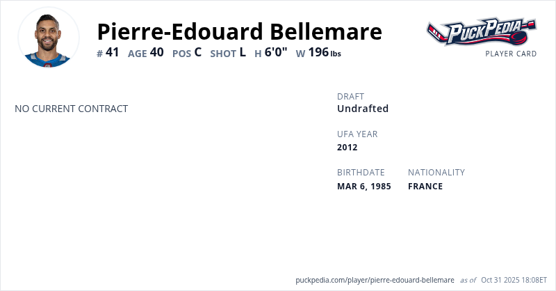 Pierre-Edouard Bellemare is an Unrestricted Free Agent. His last contract was 1 year, $775,000 with a cap hit of $775,000 per season. It expired at the end of the 2023-24 season.