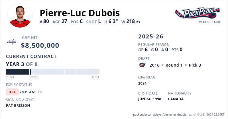 Pierre-Luc Dubois is signed to a 8 year, $68,000,000 contract with a cap hit of $8,500,000 per season, playing for the Washington Capitals. His contract expires at the end of the 2030-31 season, making Dubois an Unrestricted Free Agent.