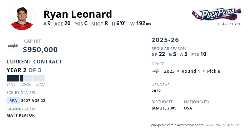 Ryan Leonard is signed to a 3 year, $2,850,000 contract with a cap hit of $950,000 per season, playing for the Washington Capitals. His contract expires at the end of the 2026-27 season, making Leonard a Restricted Free Agent.