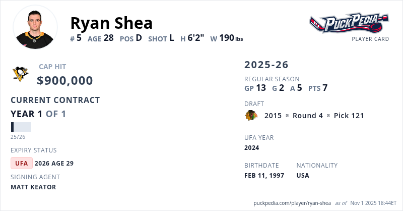 Ryan Shea is signed to a 1 year, $900,000 contract with a cap hit of $900,000 per season, playing for the Pittsburgh Penguins. His contract expires at the end of the 2025-26 season, making Shea an Unrestricted Free Agent.