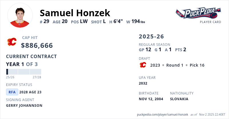 Samuel Honzek is signed to a 3 year, $2,659,998 contract with a cap hit of $886,666 per season, playing for the Calgary Flames. His contract expires at the end of the 2027-28 season, making Honzek a Restricted Free Agent.