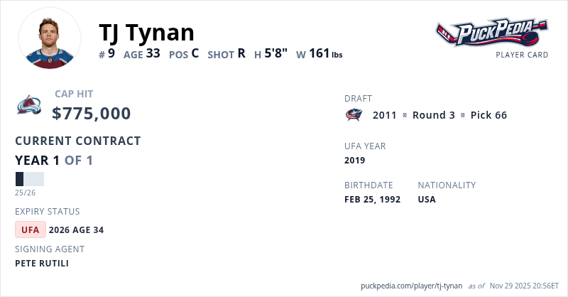 TJ Tynan is signed to a 1 year, $775,000 contract with a cap hit of $775,000 per season, playing for the Colorado Avalanche. His contract expires at the end of the 2025-26 season, making Tynan an Unrestricted Free Agent.