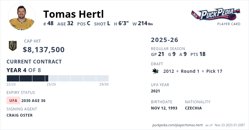Tomas Hertl is signed to a 8 year, $65,100,000 contract with a cap hit of $8,137,500 per season, playing for the Vegas Golden Knights. His contract expires at the end of the 2029-30 season, making Hertl an Unrestricted Free Agent.
