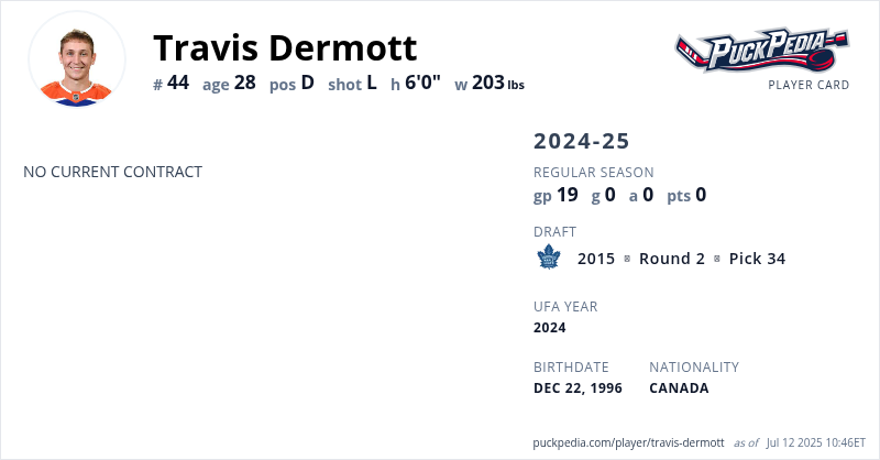 Travis Dermott is an Unrestricted Free Agent. His last contract was 1 year, $775,000 with a cap hit of $775,000 per season. It expired at the end of the 2024-25 season.