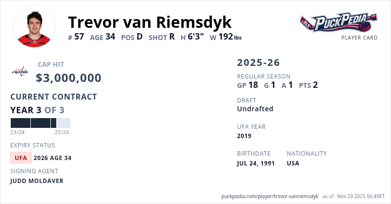 Trevor van Riemsdyk is signed to a 3 year, $9,000,000 contract with a cap hit of $3,000,000 per season, playing for the Washington Capitals. His contract expires at the end of the 2025-26 season, making van Riemsdyk an Unrestricted Free Agent.