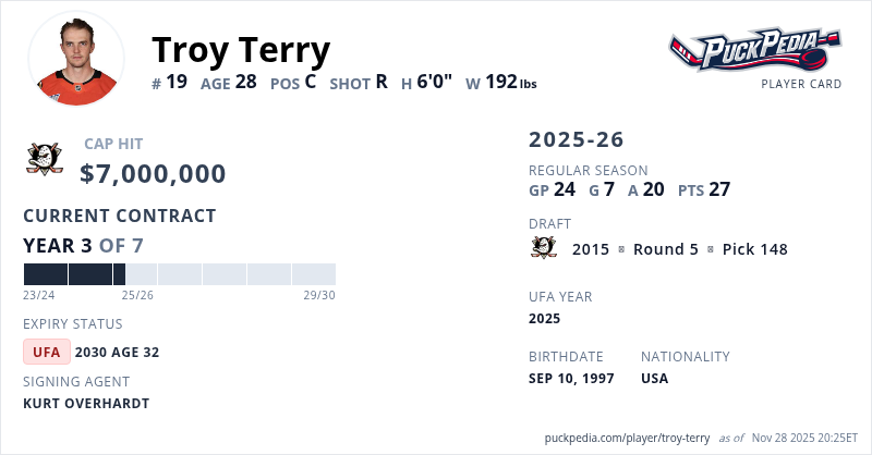 Troy Terry is signed to a 7 year, $49,000,000 contract with a cap hit of $7,000,000 per season, playing for the Anaheim Ducks. His contract expires at the end of the 2029-30 season, making Terry an Unrestricted Free Agent.