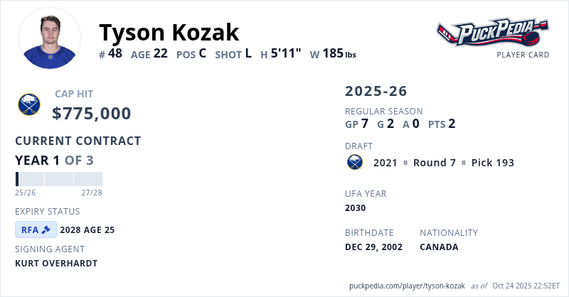 Tyson Kozak is signed to a 3 year, $2,325,000 contract with a cap hit of $775,000 per season, playing for the Buffalo Sabres. His contract expires at the end of the 2027-28 season, making Kozak a Restricted Free Agent.