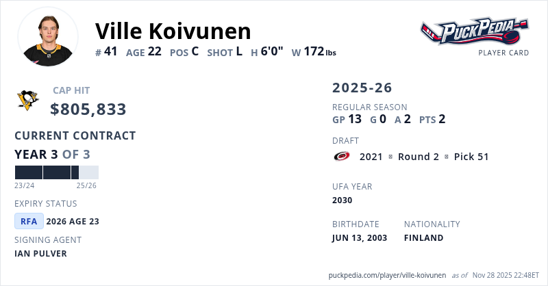 Ville Koivunen is signed to a 3 year, $2,417,499 contract with a cap hit of $805,833 per season, playing for the Pittsburgh Penguins. His contract expires at the end of the 2025-26 season, making Koivunen a Restricted Free Agent.